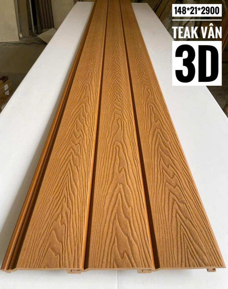 Lam 1 sóng ngoài trời 3D TEAK là loại vật liệu trang trí ngoại thất làm từ gỗ nhựa composite (WPC) có bề mặt dập nổi họa tiết vân gỗ 3D và có một đường sóng lượn (1 sóng), mô phỏng vân gỗ tự nhiên màu Teak (màu gỗ gụ), chuyên dùng để ốp tường, trần, vách ngăn ngoài trời như ban công, mặt tiền, sân vườn, chống chịu nắng mưa, mối mọt, cong vênh tốt, mang lại vẻ đẹp sang trọng, hiện đại và bền bỉ.