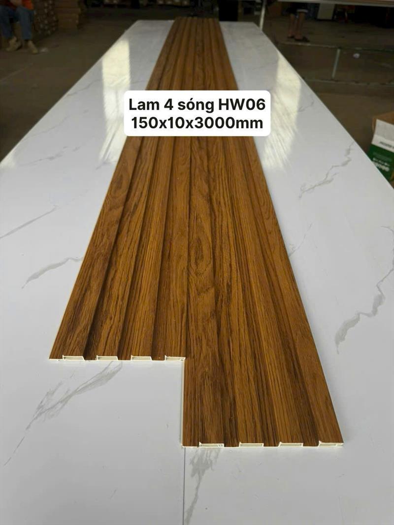 Lam ốp tường 4 sóng 06 là loại vật liệu nhựa giả gỗ (PVC hoặc WPC) cao cấp, thiết kế bề mặt gồm 4 đường gợn sóng đều nhau, thường có kích thước phổ biến rộng khoảng 15-20cm và dày 24mm. Sản phẩm này nổi bật với độ bền cao, chống thấm nước, mối mọt, thường được dùng để trang trí tường, trần, tạo điểm nhấn sang trọng, hiện đại cho không gian.