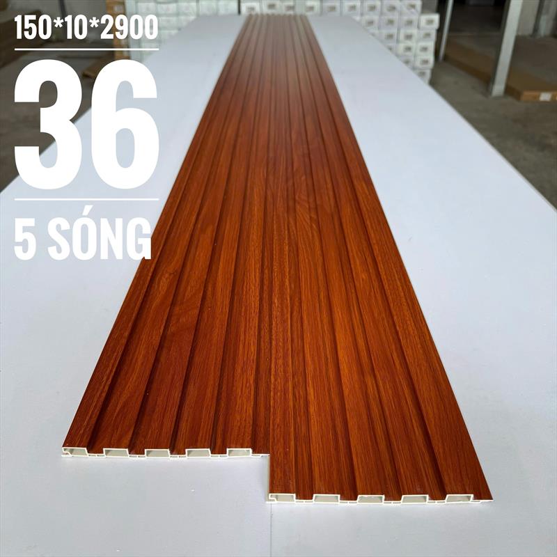 Lam sóng giả gỗ trong nhà 5 sóng 36 là vật liệu trang trí nội thất dạng tấm nhựa PVC giả gỗ, có bề mặt thiết kế 5 đường sóng thấp (mã F36/T36), kích thước tiêu chuẩn 150x9x2900mm, ứng dụng ốp tường, trần, vách TV tạo hiệu ứng 3D, chống nước, cách âm cách nhiệt hiệu quả.