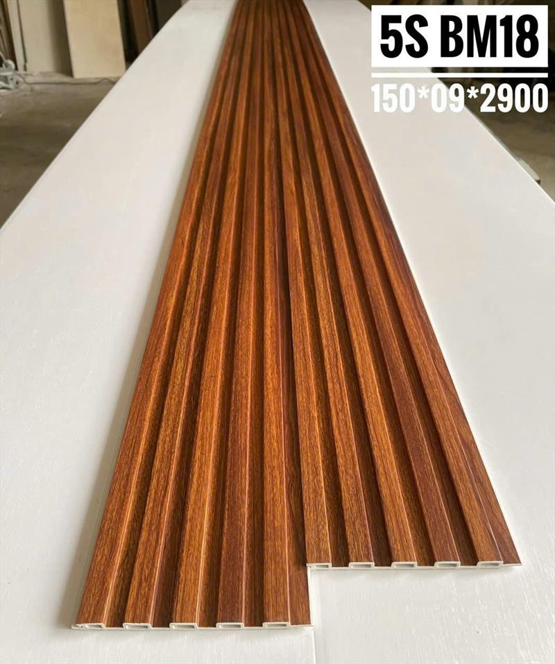 Lam sóng giả gỗ trong nhà 5 sóng BM18 là vật liệu ốp tường trang trí nội thất cao cấp, làm từ nhựa PVC và bột gỗ (WPC), có 5 đường gân sóng nổi bật, bề mặt phủ film vân gỗ chân thực, dùng để ốp tường, trần, tạo điểm nhấn 3D, mang lại vẻ đẹp sang trọng, hiện đại, lại chống ẩm, chống mối mọt và cách nhiệt tốt hơn gỗ tự nhiên, với ký hiệu "BM18" có thể là mã sản phẩm cụ thể, còn "5 sóng" là thiết kế đặc trưng có 5 sóng.