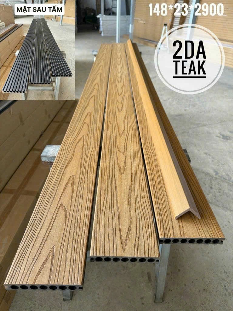 - Thẩm mỹ cao: Vân gỗ Teak tự nhiên, màu sắc bền đẹp theo thời gian nhờ lớp phủ polymer.