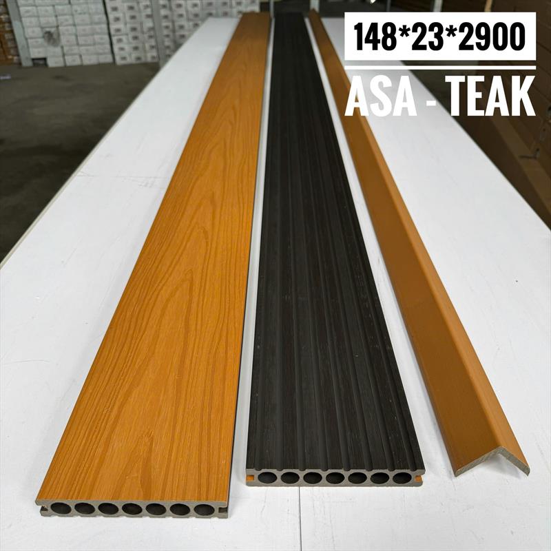 Sàn nhựa lỗ tròn ngoài trời ASA TEAK là vật liệu lát sàn composite (WPC) cao cấp, có cấu trúc lỗ rỗng (lỗ tròn) tối ưu chịu lực, bề mặt phủ lớp nhựa ASA chống tia UV siêu bền màu, màu gỗ Teak (tếch) tự nhiên, kết hợp khả năng chống nước tuyệt vời, chống trơn trượt và chống mối mọt, lý tưởng cho hồ bơi, ban công, sân vườn nhờ độ bền cao và tính thẩm mỹ sang trọng.