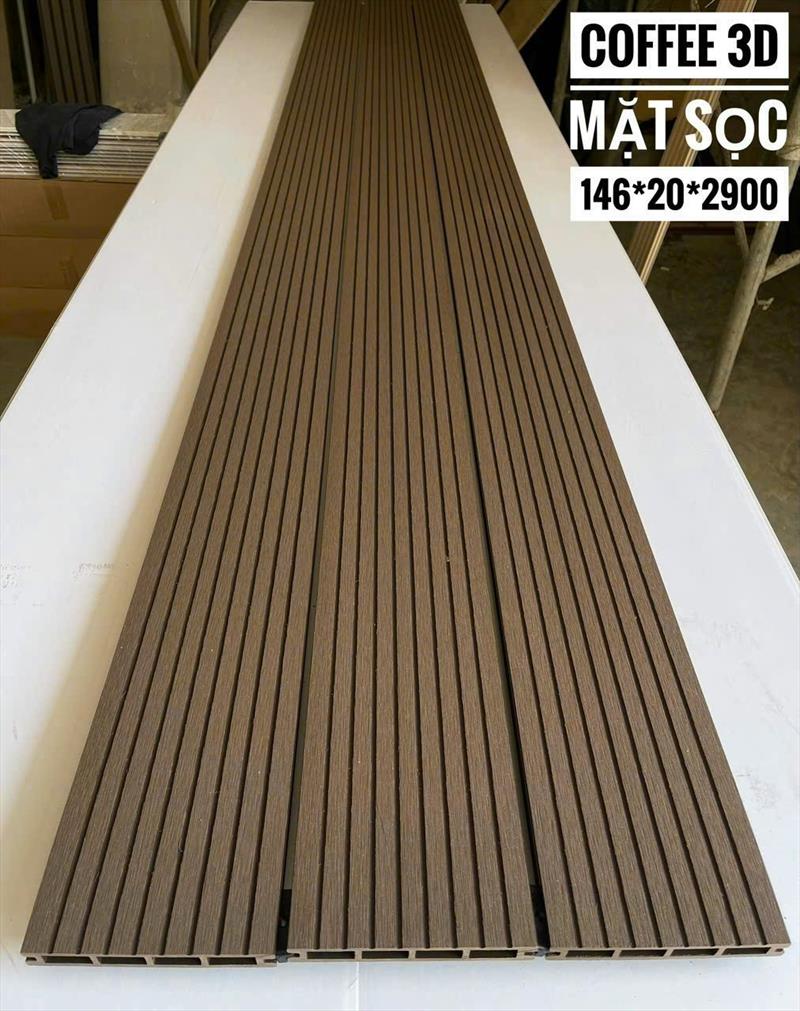 Sàn nhựa ngoài trời lỗ vuông 3D Coffee day 20mm mặt sọc là loại ván sàn làm từ gỗ nhựa composite (WPC), chuyên dùng cho không gian ngoại thất (sân vườn, hồ bơi, ban công), có các lỗ vuông để thoát nước và tăng tính thẩm mỹ, màu nâu "Coffee" ấm áp, vân sọc 3D giả gỗ tự nhiên, dày 20mm, chống trượt, chống nước, chịu lực, bền bỉ với thời tiết.