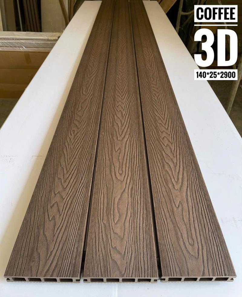 Sàn nhựa ngoài trời lỗ vuông 3D Coffee dày 25mm là vật liệu composite (WPC) chuyên dụng cho không gian ngoại thất (ban công, hồ bơi, sân vườn), có cấu tạo từ bột gỗ, nhựa PVC/PE và phụ gia, bề mặt giả gỗ vân 3D màu nâu Coffee, thiết kế lỗ vuông giúp thoát nước, độ dày 25mm cho khả năng chịu lực, chống cong vênh, mối mọt, chịu nước tốt, bền bỉ dưới nắng mưa.