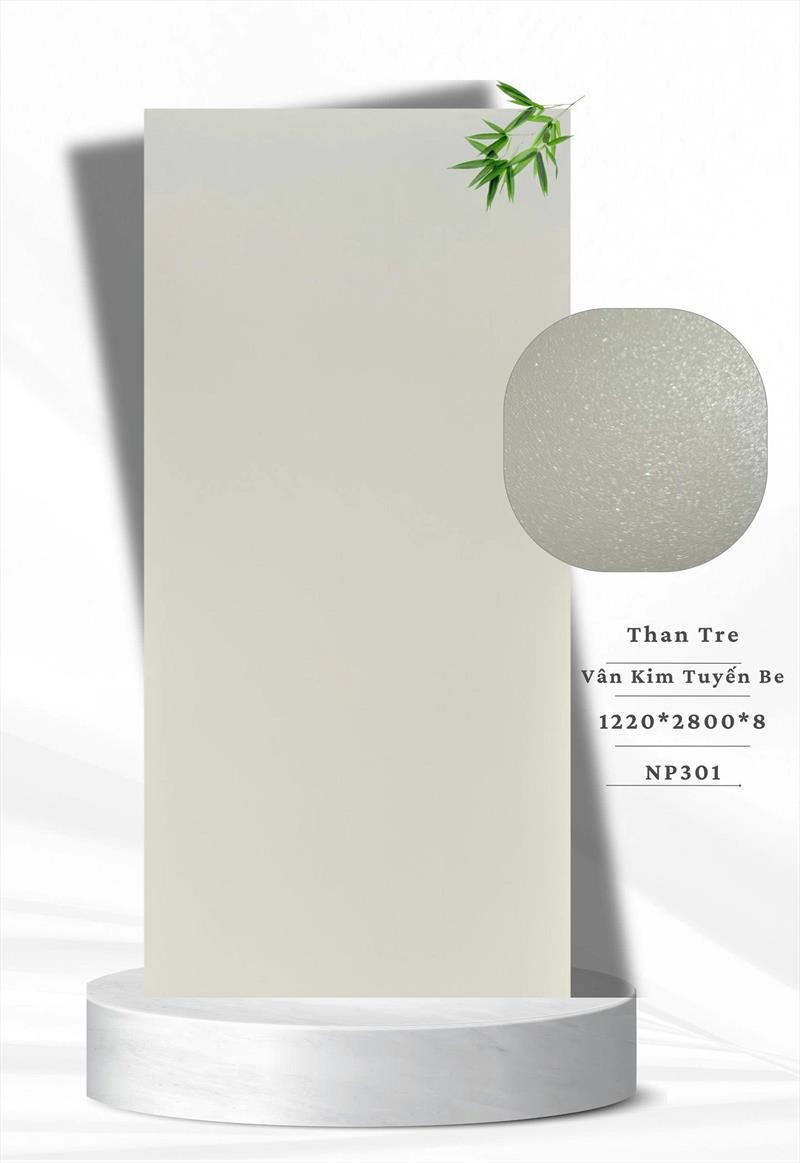 Tấm ốp than tre vân kim tuyến be là vật liệu trang trí nội thất cao cấp, làm từ cốt sợi than tre kết hợp nhựa, có lớp film bề mặt màu be (kem/nâu nhạt) với hiệu ứng ánh kim lấp lánh như kim tuyến, tạo cảm giác sang trọng, hiện đại, mô phỏng kim loại nhưng nhẹ hơn, dễ thi công, chống ẩm, chống mối mọt, an toàn sức khỏe (chuẩn E0).